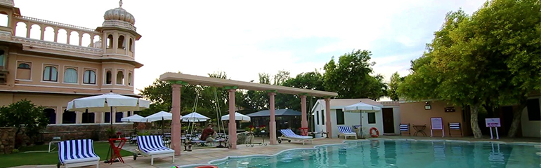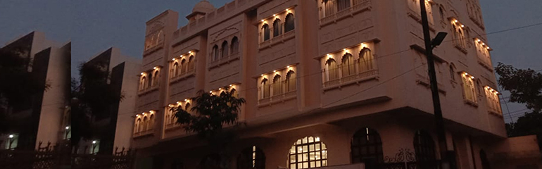 Traditional Jaipur hotel with carved balconies and courtyards.